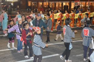 Then the bon dancing began. Both teams and their community representatives gathered in long oval circles between the dashis. Music floated out of one of the dashis and they all danced in a coordinated manner with elaborate foot and hand gestures that had obviously been practiced with great care. Older women in matching kimonos would be a part of each line along with the men and women in matching team outfits as well. Children in similar outfits formed an inner circle and did their own variations of the dances.