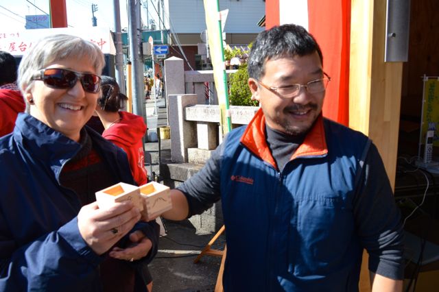 We walked on to the shrine and found a hundred or more food and game booths on each side of several streets that converge on the shrine. Hundreds of people were there by 11 AM and there would be thousands by sunset. We stopped first to sample the sake in the administrative booth, which makes a donation to the event at the same time. Sake is served in small square cedar boxes, which gives it a distinctive woody flavor and scent.