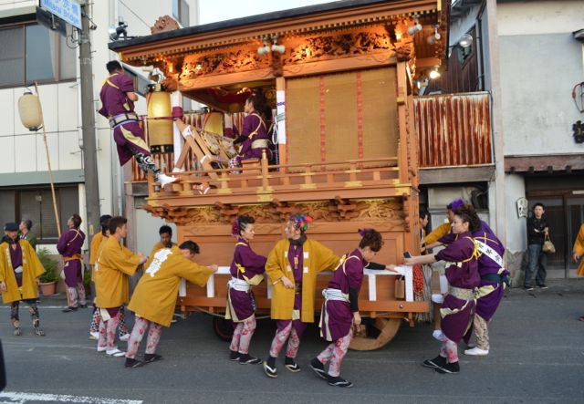 By 4 PM the twenty dashis and their push/pull teams lined up on the streets right in front of the shrine in pairs, facing each other. After a meeting with the judge of their competition each team began beating drums, playing flutes and banging brass cymbals. They each rolled forward towards the other, until the frames of the dashis were almost touching, with musicians hanging off the front, glaring at each other while trying to put their opponents off beat. The battle of the bands continued for about eight minutes. Finally they rolled back 30 or 40 feet to catch their breath and then they charged each other again for another couple of minutes of close competition. This all included lots of enthusiastic noise from the push/pull teams who must be both reckless and careful to push and pull the dashis to get them rolling and then stop them when faces are just inches apart. Finally they rolled back for the judging, conducted by a team of observers, and the head judge announced a winner.