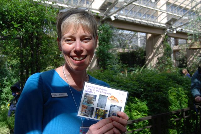 An interpreter, like Nancy, at Longwood Gardens might tell a story as part of the experience but uses other media and approaches as well such as this “Can you find” activity.