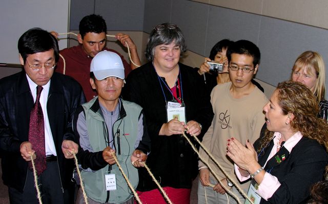Maria Elena Muriel of Mexico had her non-English speaking audience in Korea totally enthralled as she invited the audience to build the warp of a loom from ropes to weave a giant fabric.