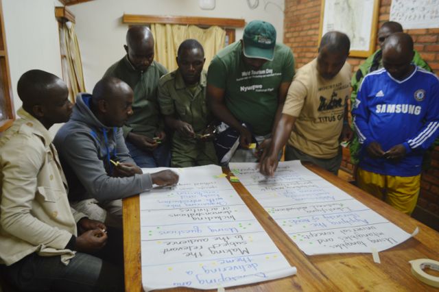 Our role at Nyungwe has taken place over the last eighteen months in three separate trips. In October of 2012, we first assessed the guides’ performance and the overall visitor experience in the park and then suggested next steps for training the 22 guides and improving the guest experience. In February of 2013 we returned to train all of the guides as National Association for Interpretation (NAI) Certified Interpretive Guides (CIG). Each of them passed the course, demonstrating a great deal of enthusiasm for their continuing professional development. We also trained a number of students attending the local tourism college, hotel staff, and community cooperative members who offer tours in beekeeping operations and cultural villages, certifying a total of 27 guides and 18 hosts.