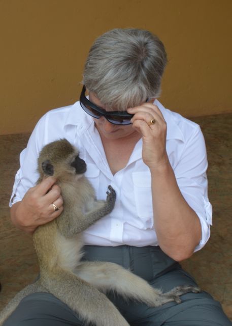 Our little friend Jes, the vervet monkey, visits our classroom in Rwanda each day. She doesn’t say much, but she definitely has a story. Akagera park officials learned that a young monkey had been taken as a pet, a violation of the law, so it was taken from the people and brought to the park. Over time it was reintroduced to wild vervets and it lived with them for many months. One day it returned to park headquarters on its own with a badly damaged hand, which led to amputation of the limb almost to the elbow. So Jes has become the unofficial headquarters mascot. She’s free to return to the wild anytime, but because of her injury and the stunted growth that is probably the result of malnutrition when young, it is unlikely that she will thrive or be accepted in a completely wild monkey troop. When she gets comfortable with you, she will sit in your lap and let you pet and preen her. She will return the favor and check you carefully for fleas and dirt. She’s a real charmer, but sadly, she is no longer equipped to be a wild monkey.