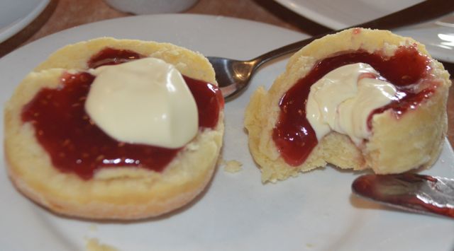 opted for tea instead, but we did note that the large milking barn had viewing windows all the way round allowing a self-guided view of the activities in the barn. We went into the café and enjoyed delicious scones, like the American biscuits you’d get with biscuits and gravy but served with berry jam and fresh clotted cream with hot coffee. Heaven. As I paid the bill, we browsed the gift shop, which had tea towels and other items with iconic black and white cows, along with a variety of the jams and honey made on the farm, local wines, and of course, a variety of stuffed toy farm animals. On the way out I was amused by the farm weather station that used a rock on a rope to monitor conditions.
