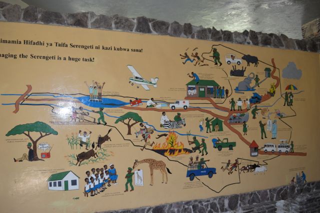 Tingatinga artwork on this mural at the Serengeti Visitor Center in Tanzania tells the management story for the park.
