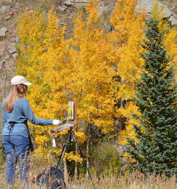 We drove up to Hidden Valley and stopped to enjoy a picnic lunch surrounded by golden and red-orange clumps of aspens with shimmering, almost iridescent leaves. Another artist just